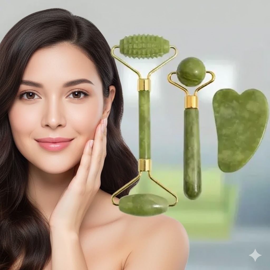 Transforme sua rotina de cuidados com a pele com o poder ancestral da pedra natural de Xiuyu (jade). O Massageador Facial com Rolo de Jade e Gua Sha foi desenvolvido para reduzir inchaço, suavizar linhas finas, melhorar a circulação e promover um lifting natural, deixando a pele mais firme, luminosa e descansada.
